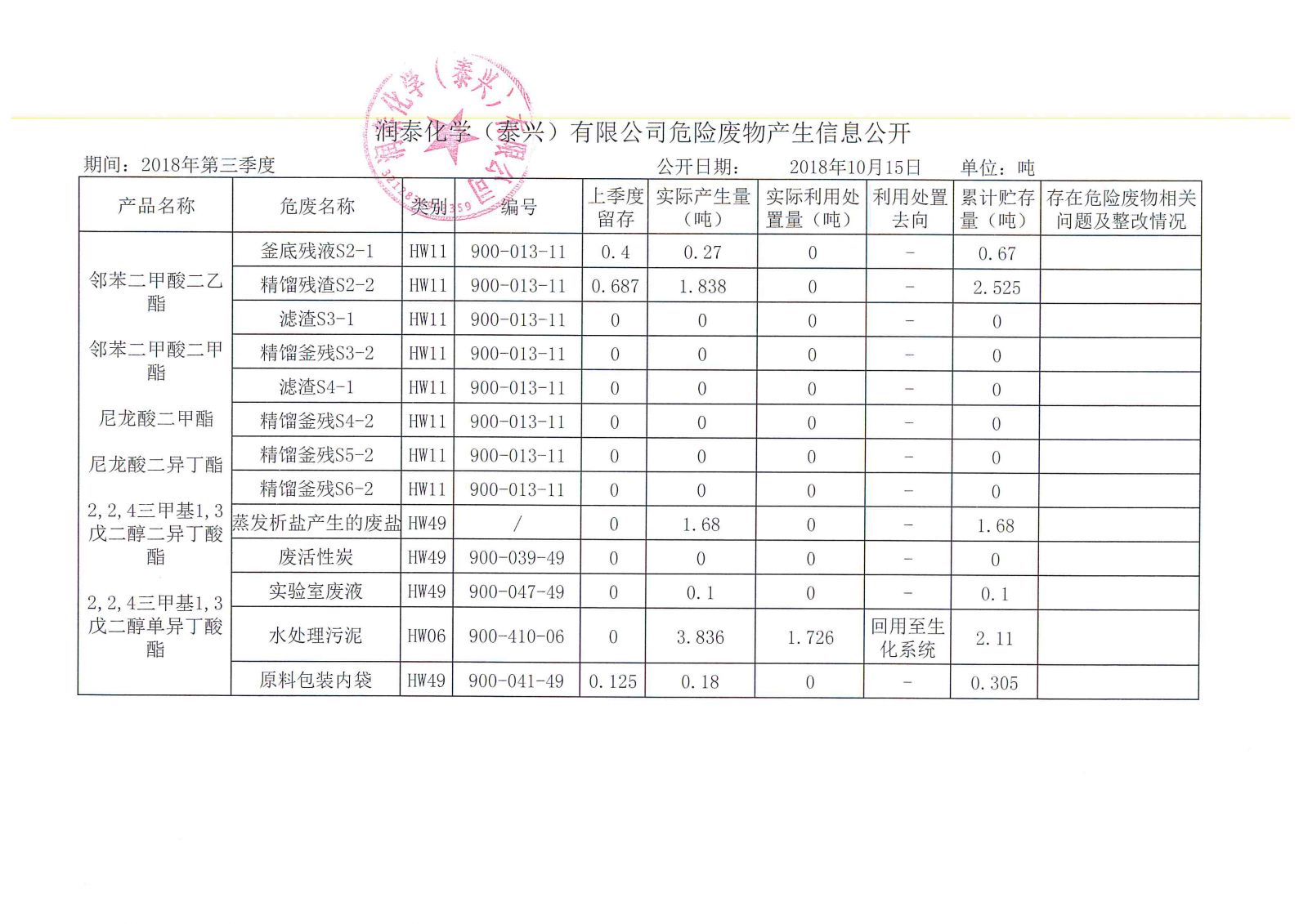 润泰化学(泰兴)有限公司危险废物信息公示(2018第三季度)