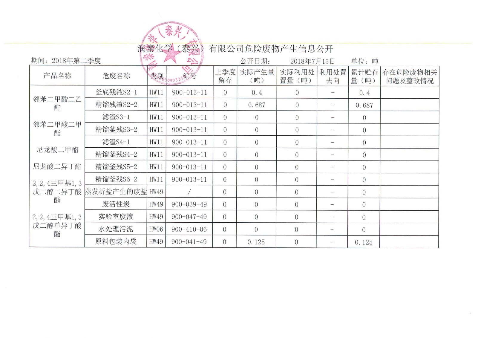 润泰化学(泰兴)有限公司危险废物信息公示(2018第二季度)