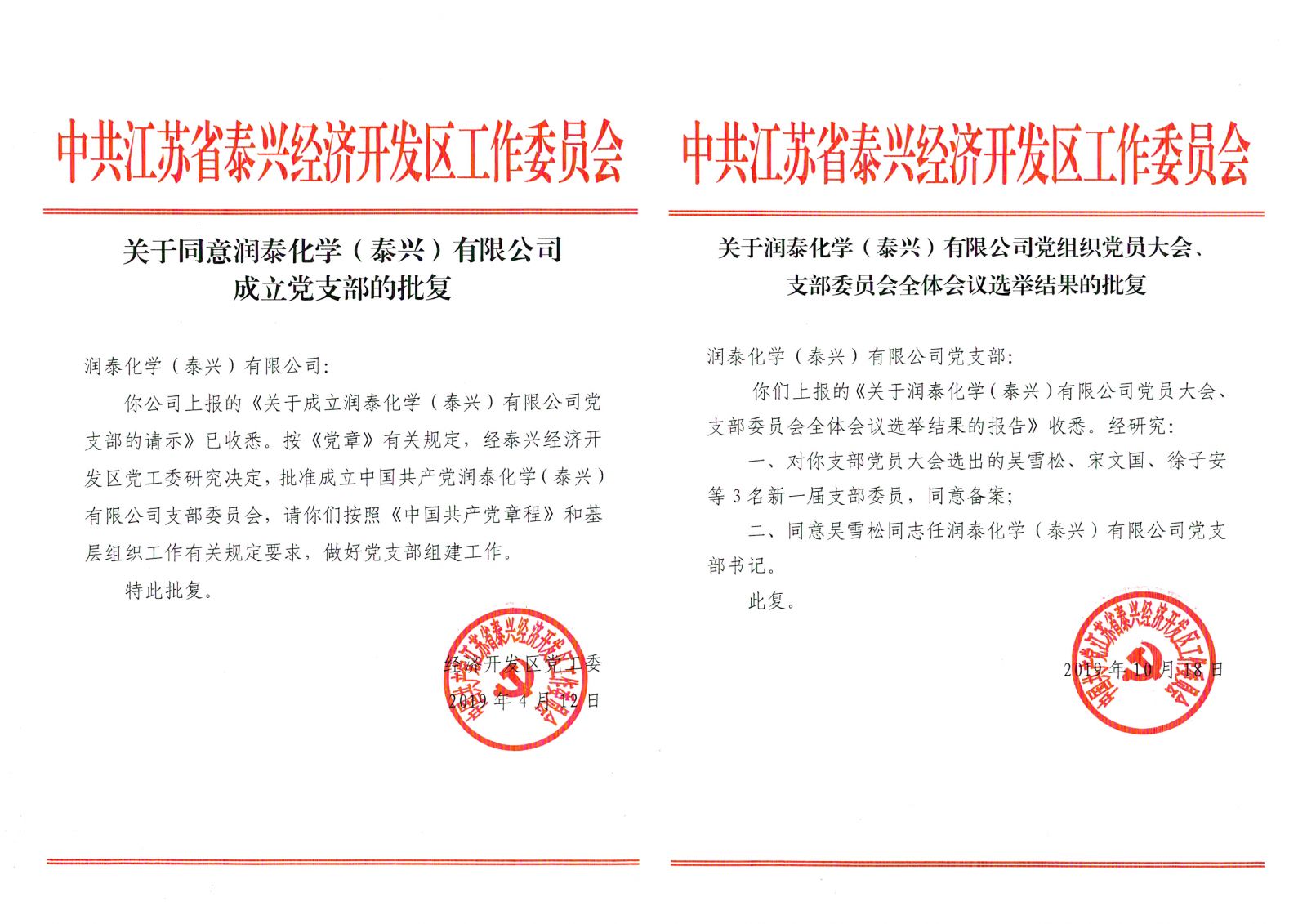润泰股份党建负责人张云峰同志出席并主持会议,杨萍同志监票。张云峰同志表示,成立泰兴公司党支部意义重大,希望支部委员精诚合作,树立良好榜样,带领全体党员对公司的经营工作起到促进作用。10月18日,中国共产党江苏省泰兴经济开发区工作委员会批复同意润泰化学(泰兴)有限公司党员大会、支部委员会全体会议选举结果,同意吴雪松同志任党支部书记。