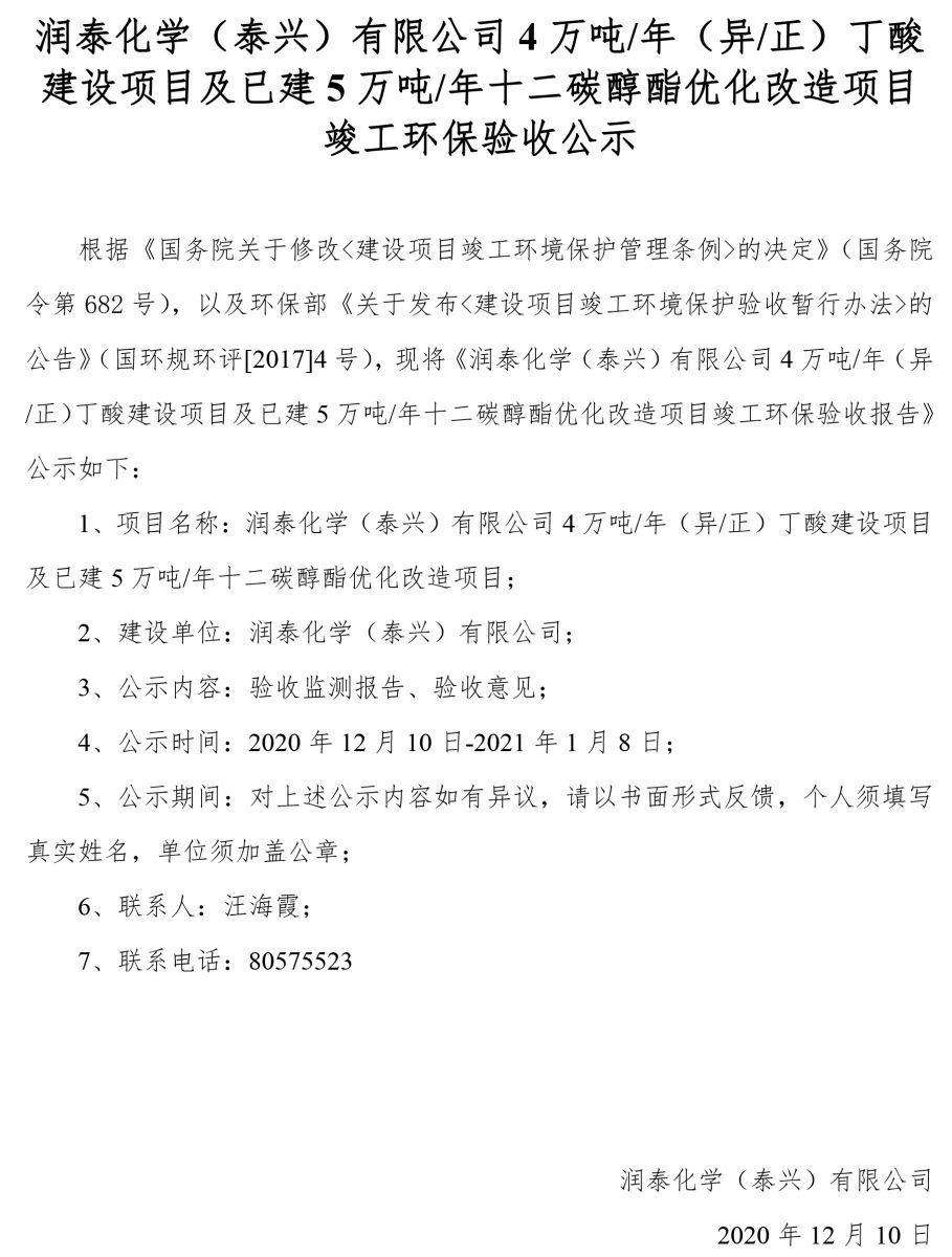 润泰化学(泰兴)有限公司4万吨/年(异/正)丁酸建设项目及已建5万吨/年十二碳醇酯优化改造项目竣工环保验收公示
