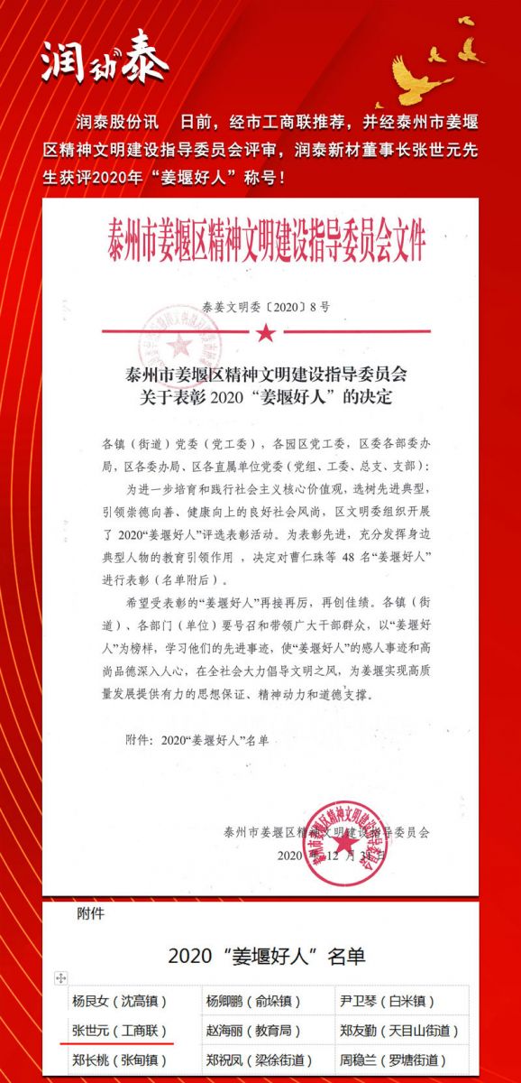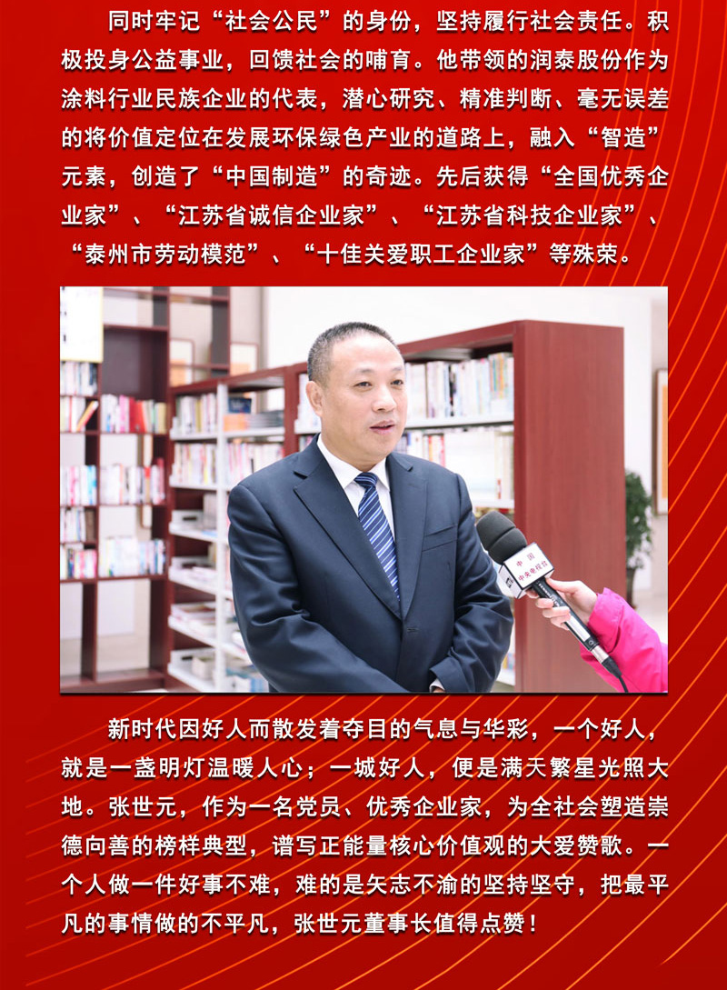 【身边好人】润泰股份董事长荣获“姜堰好人”称号