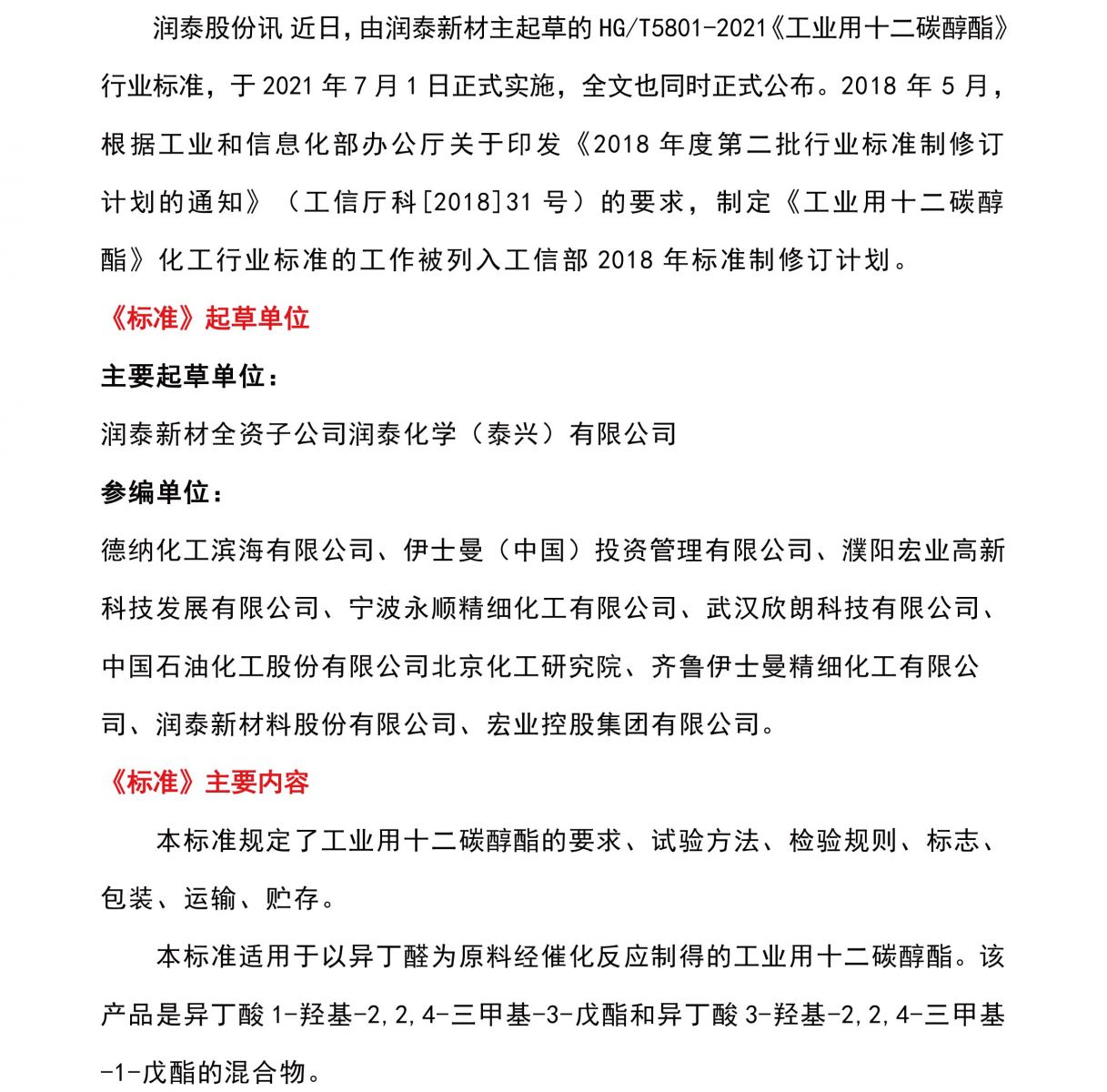 润泰新材主起草的HG/T5801-2021《工业用十二碳醇酯》全文正式公布