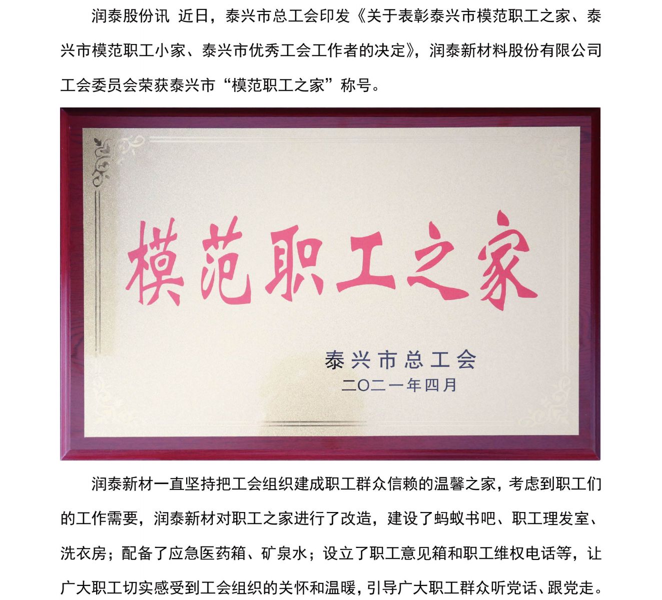 润泰新材料工会荣获泰兴市“模范职工之家”称号