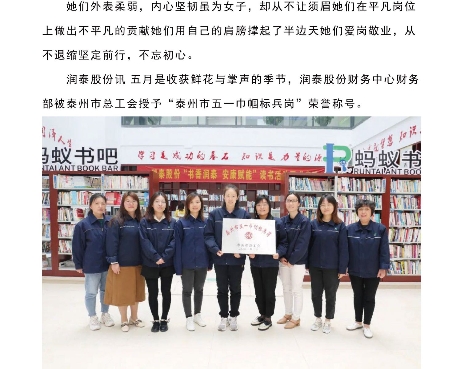 润泰股份财务部荣获“泰州市五一巾帼标兵岗”荣誉称号