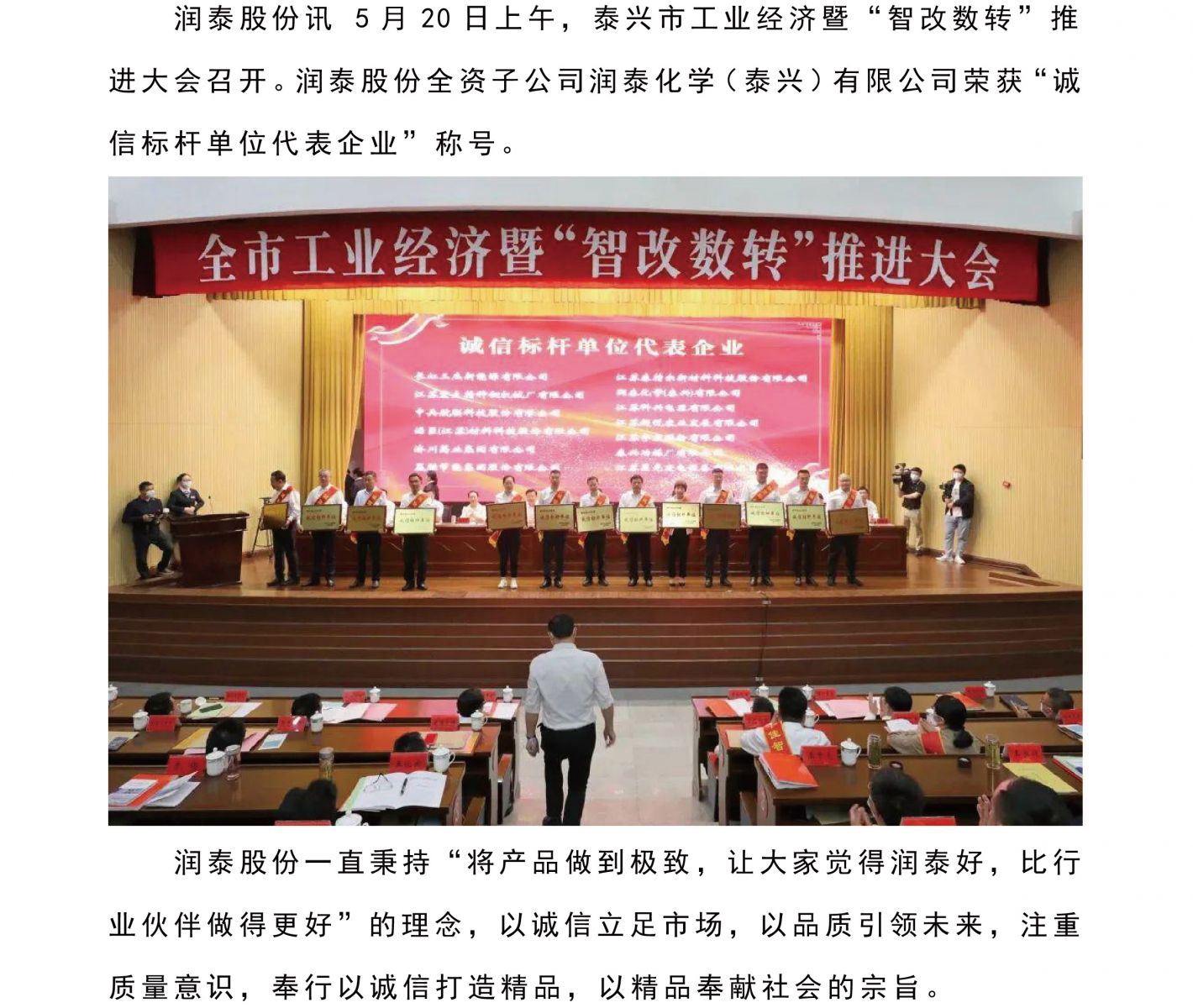 润泰化学(泰兴)有限公司荣获“诚信标杆单位代表企业”称号