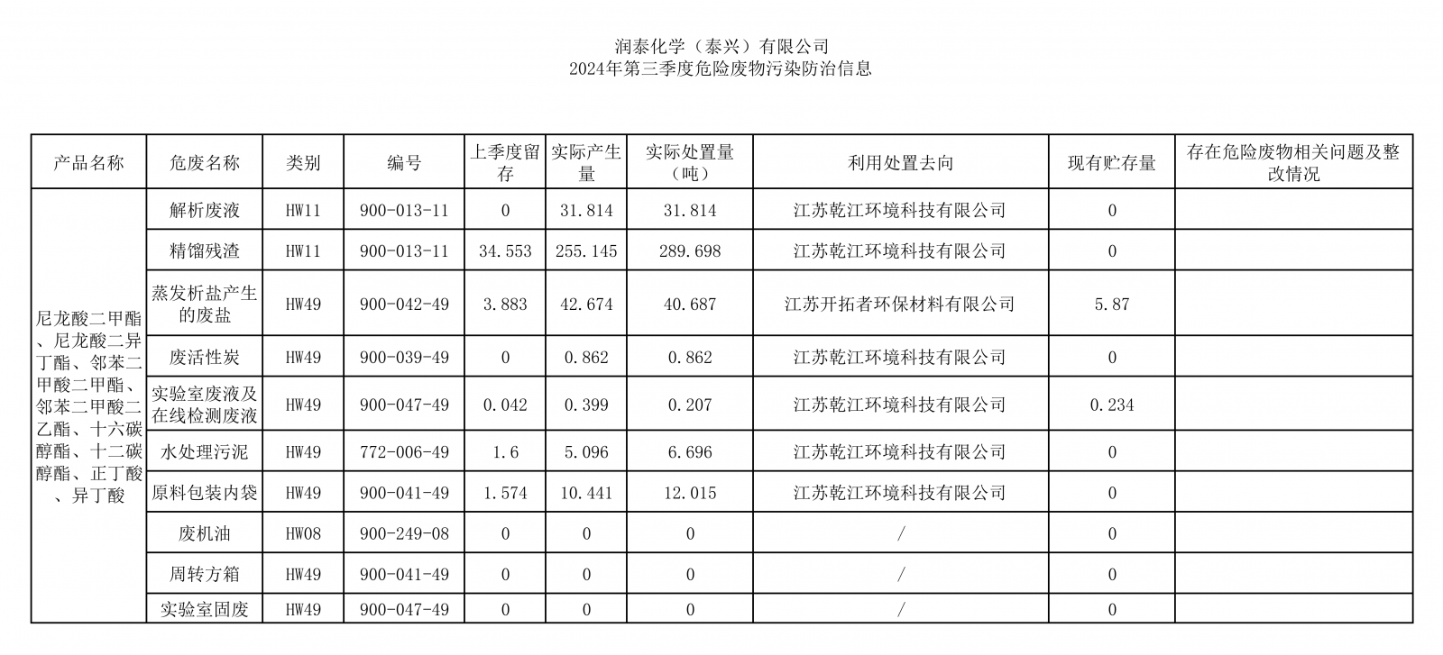 润泰化学(泰兴)有限公司 2024年第三季度危险废物污染防治信息公示