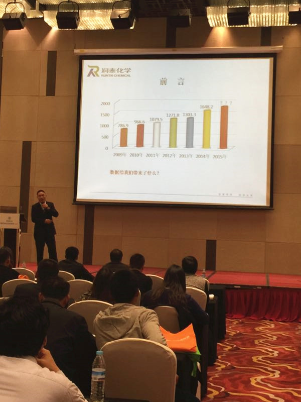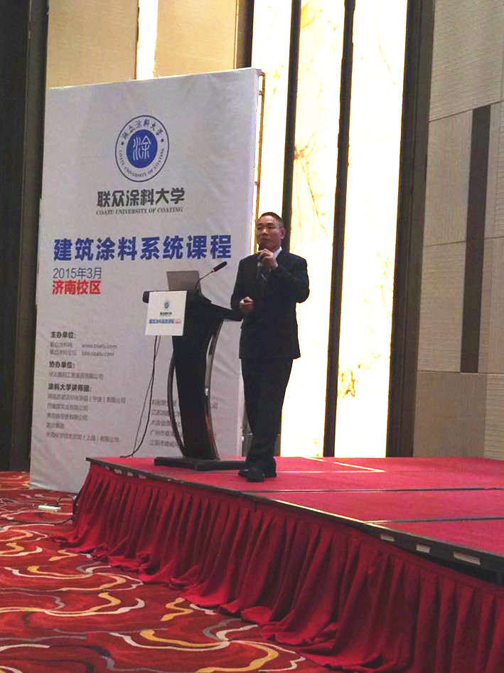 《技术推动销售,专业铸成未来》,2015年3月27,28日为期两天的联众涂料大学建筑涂料系统课程培训在美丽的济南开课了。涂料大学是联合行业知名企业和资深专家作为协助,组成的一个系统学习平台。来自山东、天津等地区的涂料企业工程师们前来参加。润泰化学副总经理、高级工程师张高锋作为联众涂料大学认证讲师,担任此次[RUANTA成膜助剂在乳液建筑涂料中应用探讨]为课题的演讲嘉宾。